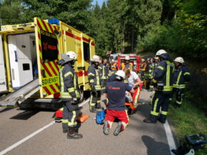 Am 15.08.2023 gegen 14:45 Uhr wurden wir zusammen mit der FF Oberneuschönberg,der FF Heidersdorf und dem Rettungsdienst zu einem Verkehrsunfall zwischen Olbernhau und Heidersdorf durch die IRLS Chemnitz alarmiert. Ein PKW Kia kollidierte aus bisher ungeklärter Ursache mit einem LKW. Im Anschluß kam der PKW in einer steilen Rechtskurve von der Fahrbahn ab und rutschte in den Straßengraben, wo er an einer Steinmauer zum stehen kam. Bei dem Aufprall wurde der Fahrer verletzt und musste mit Hilfe von hydraulischen Rettungsgerät aus seinem Auto befreit werden. Er wurde im Anschluß dem Rettungsdienst übergeben und in ein Krankenhaus eingeliefert.